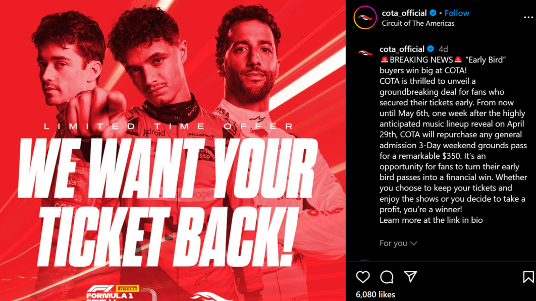 COTA offers $350 buyback for F1 U.S. Grand Prix early bird passes it sold for $299