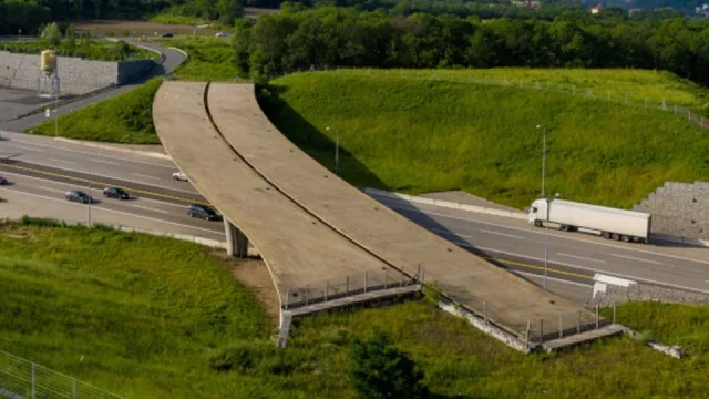 Je to nejzbytečnější stavba na Pražském okruhu. Most nikam nevede a chátrá 15 let